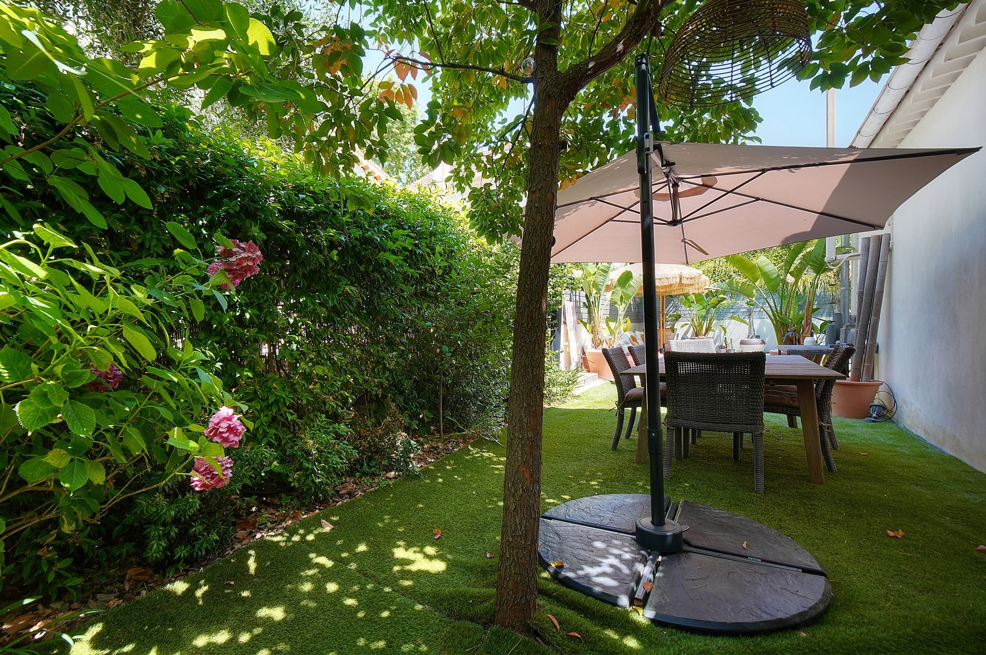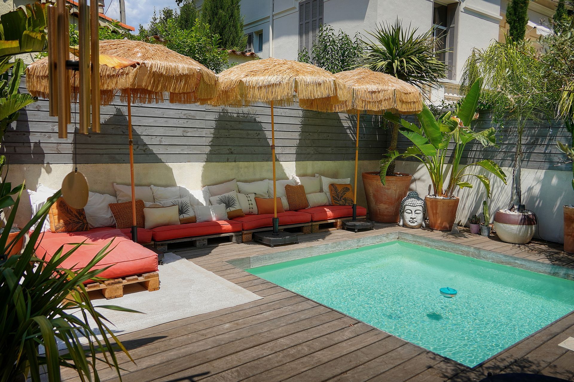 • Exotic garden & zen atmosphere: Enjoy a beautiful outdoor space featuring a private swimming pool, wooden sun decks, palm trees, banana plants, and other Mediterranean vegetation.