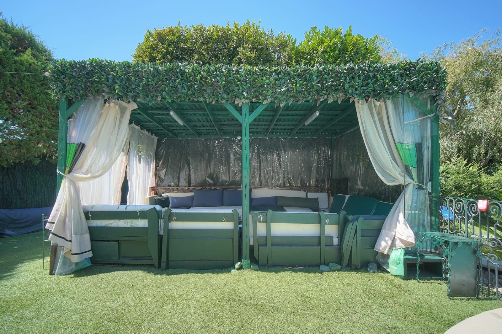 Proche de la piscine, une pergola couverte de 3 x 5 mètres permet d’abriter les enfants du soleil ou de disposer des canapés pour éviter tout risque d’accès à la piscine.