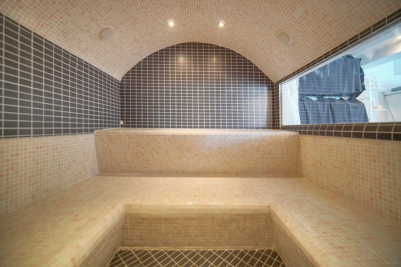 The 5 x 6.5 meter garage is tiled, air-conditioned, includes a TV, a shower and washbasin, and can be used as a game room or accommodate 2 to 4 extra guests.