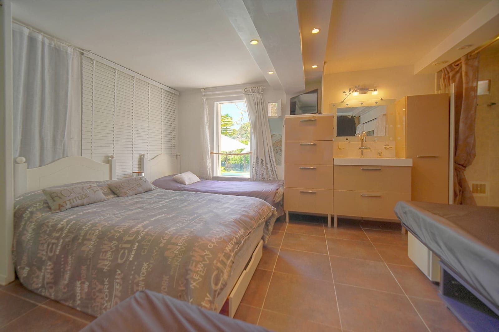 Un garage carrelé de 5 x 6,5 m, climatisé, avec TV, salle de douche et vasque, est également aménagé en salle de jeux ou peut accueillir 2 à 4 couchages supplémentaires.